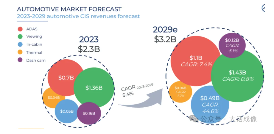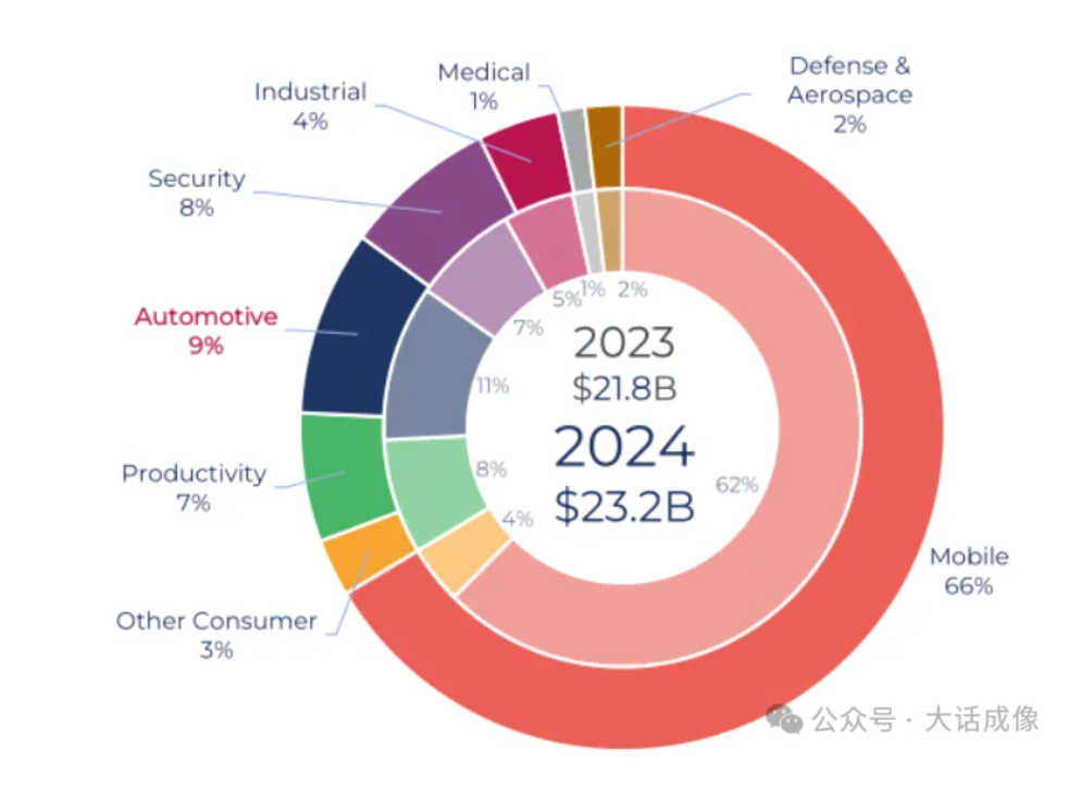 자동차용 카메라는 급속히 성장하여 보안 카메라를 제치고 9%의 점유율을 기록하며