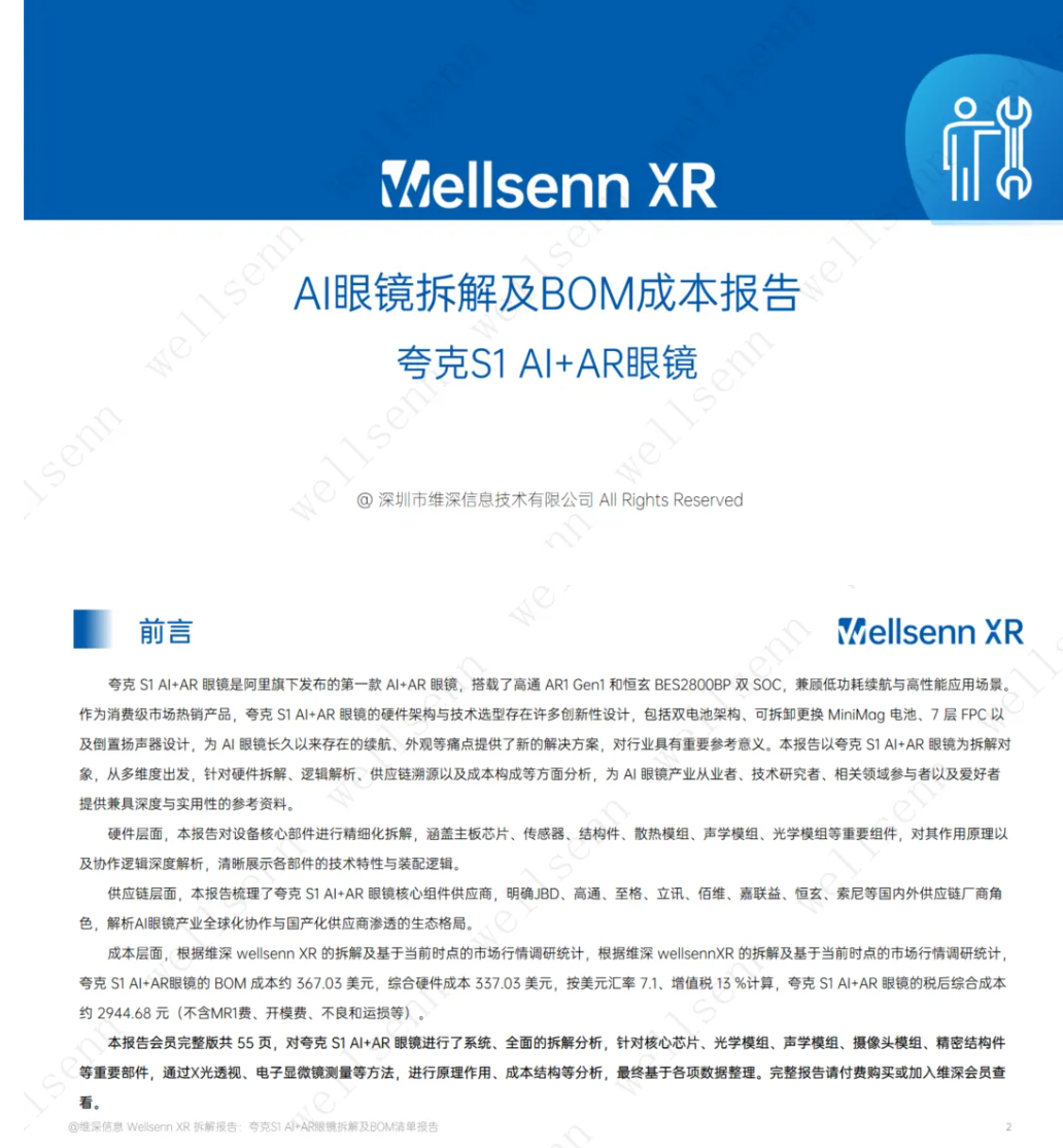 비용 측면에서, 웰센 XR 분해 및 현재 시장 조사에 따르면 쿼크 S1 AI+AR 안경의 BOM(부품 목록) 비용은 약 367.03달러이고,
