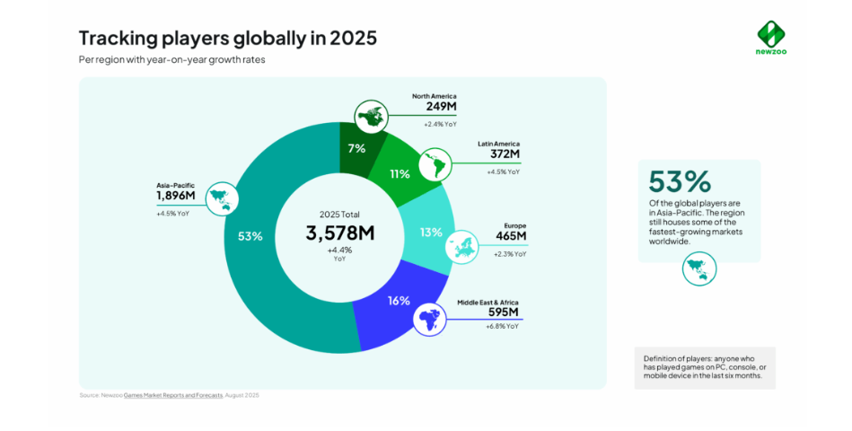 아시아 태평양 지역은 19억 명의 플레이어를 보유하며 전 세계 플레이어 수의 53%를 차지하며